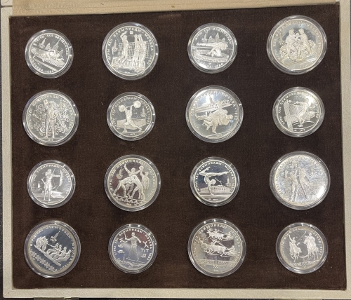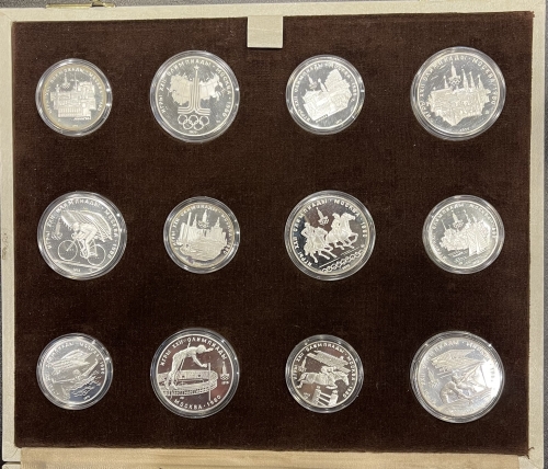 Набор из 28 серебряных монет Олимпиада 80, номинал 10 и 5 рублей, 1977-1980гг. в подарочном футляре