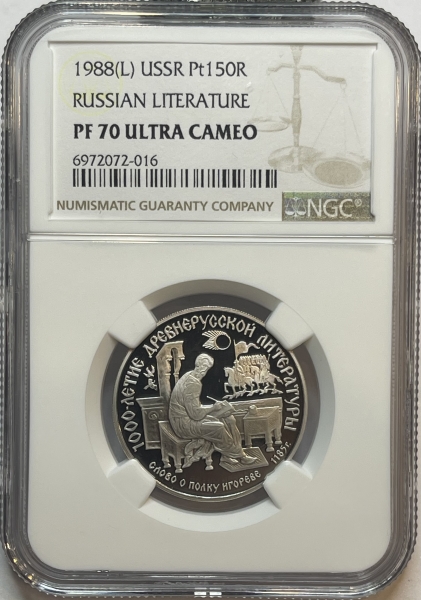 Платиновая монета 150 рублей "Слово о полку Игореве" 500-летие Единого Русского Государства 1988г., Pt 999, 15,55г., ЛМД в слабе NGC PROOF 70 ULTRA CAMEO
