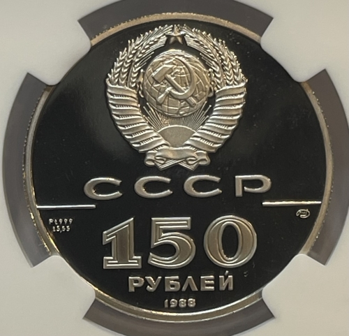 Сверху герб СССР с 15 витками ленты, под ним буквы «СССР», ниже слева и справа черта, под чертой слева химическое обозначение «Pt» и проба «999» металла из которого сделана монета, под ними чистый вес драгоценного металла «15,55», под чертой справа монограмма монетного двора «ЛМД», ниже обозначение достоинства монеты цифра «150» и ниже слово «РУБЛЕЙ», внизу у канта год выпуска монеты «1988».