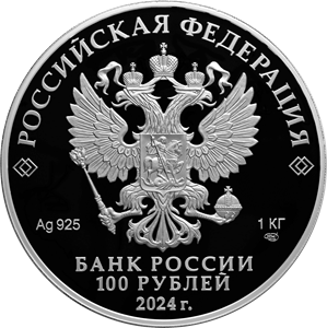 рельефное изображение Государственного герба Российской Федерации, над ним вдоль канта – надпись полукругом «РОССИЙСКАЯ ФЕДЕРАЦИЯ», обрамленная с обеих сторон сдвоенными ромбами, под гербом слева – обозначения драгоценного металла и пробы сплава, справа – содержание химически чистого металла и товарный знак монетного двора, внизу в центре в три строки – надпись «БАНК РОССИИ», номинал монеты «100 РУБЛЕЙ», год выпуска «2024 г.».