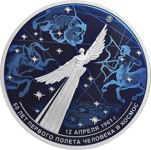 на зеркальном поле диска — рельефные изображения летящей фигуры человека с крыльями и звезды в виде вставки из искусственного камня на фоне выполненных в цвете стилизованных изображений звездного неба и мифологических животных — зодиакальных созвездий Тельца, Льва, Стрельца; внизу вдоль канта — надписи: «12 АПРЕЛЯ 1961 г.», «60 ЛЕТ ПЕРВОГО ПОЛЕТА ЧЕЛОВЕКА В КОСМОС».