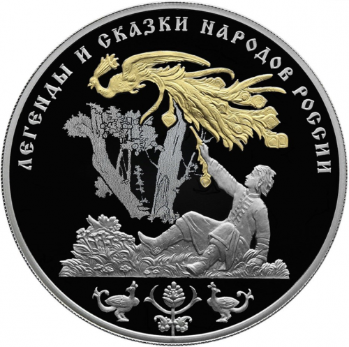 на зеркальном поле диска – рельефное изображение золотой жар-птицы, взлетающей с дерева, и Ивана-царевича, поймавшего ее перо, внизу – элементы традиционного русского орнамента, вверху вдоль канта – надпись: "ЛЕГЕНДЫ И СКАЗКИ НАРОДОВ РОССИИ".
