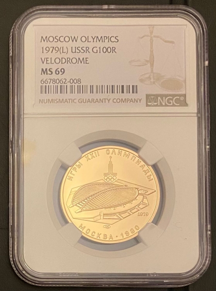 Золотая монета 100 рублей "Велотрек" Олимпиада 80. 1979г. ЛМД в слабе NGC MS 69