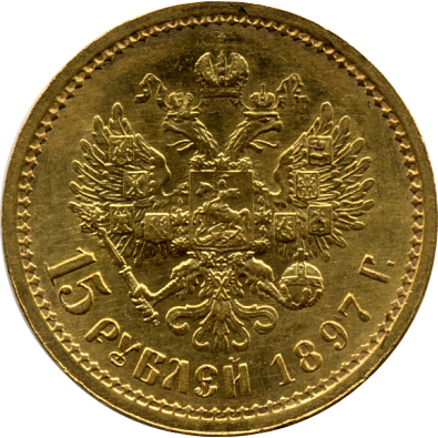 Реверс: В центре изображен Малый Государственный Герб Российской империи - двуглавый орёл, головы которого увенчаны двумя коронами, третья, большая корона над ними. Все они соединены орденской лентой ордена Св. Апостола Андрея Первозванного. На груди орла расположен Московский герб - щит с изображением Георгия Победоносца с копьём, поражающего дракона. Вокруг щита цепь ордена Св. Апостола Андрея Первозванного. На крыльях изображены гербы: Царства Казанского, Польского, Херсонеса Таврического, Астраханского, Сибирского, Грузинского и герб соединенных княжеств Киевского, Новгородского и Владимирского — по 4 на каждое крыло. В правой лапе орла – скипетр, в левой – держава. Под ним слева направо изображены: номинал - надпись «15 РУБЛЕЙ» и дата выпуска «1897 Г.». По окружности канта имеются рельефные элементы, выполненные в виде зубцов.