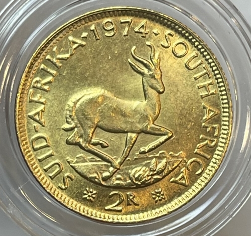 Золотая монета 2 ранда ЮАР 1974г., Au 917, вес 7,994г.