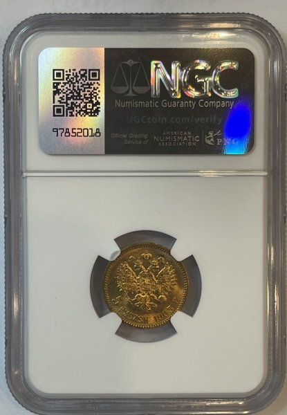 Золотая монета 5 рублей Николай II ,1903 г. АР, в слабе NGC MS 65