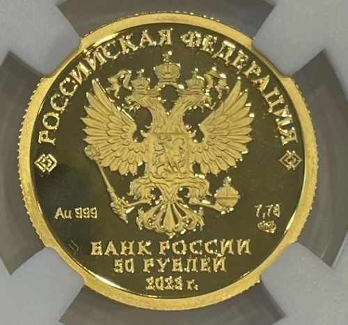 рельефное изображение Государственного герба Российской Федерации, над ним вдоль канта – надпись полукругом «РОССИЙСКАЯ ФЕДЕРАЦИЯ», обрамленная с обеих сторон сдвоенными ромбами, под гербом: слева – обозначения драгоценного металла и пробы, справа – содержание химически чистого металла и товарный знак монетного двора, внизу в центре в три строки – надпись «БАНК РОССИИ», номинал монеты «50 РУБЛЕЙ», год выпуска «2023 г.».