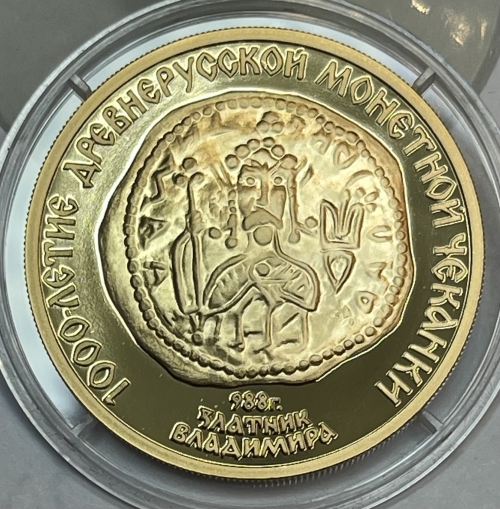 Слева, сверху и справа вдоль канта монеты слова «1000-ЛЕТИЕ ДРЕВНЕРУССКОЙ МОНЕТНОЙ ЧЕКАНКИ», в середине изображение златника Владимира Святославовича, под ним год крещения Руси князем Владимиром Святославовичем «988 г.», ниже друг под другом слова «ЗЛАТНИК» и «ВЛАДИМИРА».