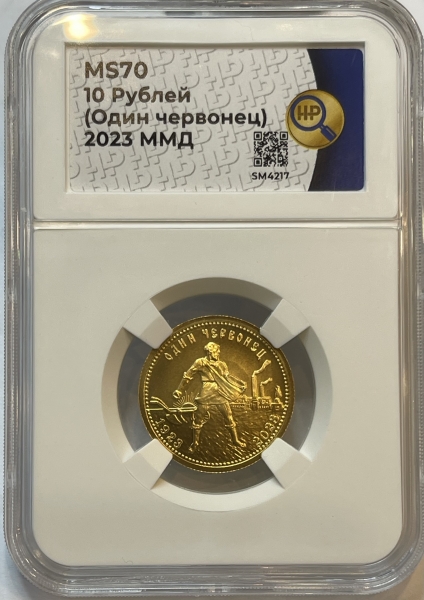 Однако для оборота выпускали не только бумажные деньги. С 1923 года на Петроградском монетном дворе начали выпускать золотые монеты-червонцы, которые по своим параметрам повторяли царские 10 рублей. Их дизайн был разработан медальером Антоном Васютинским на основе эскиза для одной из дореволюционных сельскохозяйственных выставок. На монете в полный рост изображен крестьянин-сеятель на фоне дымящихся труб, плуга и восходящего солнца. Золотых червонцев, датированных 1923 годом, было выпущено чуть более 2,7 млн штук.