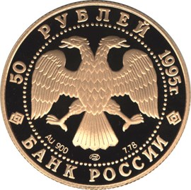 в центре диска - эмблема Банка России (двуглавый орёл художника И. Билибина), в нижней части - обозначение металла, проба сплава, товарный знак монетного двора и содержание драгоценного металла в чистоте. По окружности надписи, обрамлённые кругом из точек: вверху - "50 РУБЛЕЙ 1995 г.", внизу - "БАНК РОССИИ".