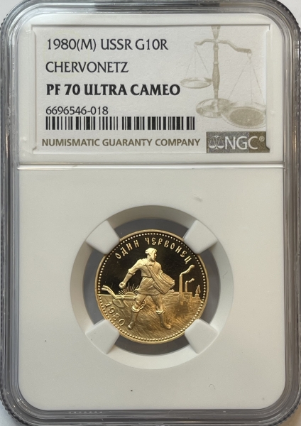 Золотая монета Червонец "Сеятель" ММД , 8,6 грамм 1980 год, в слабе NGC PROOF 70 ULTRA CAMEO