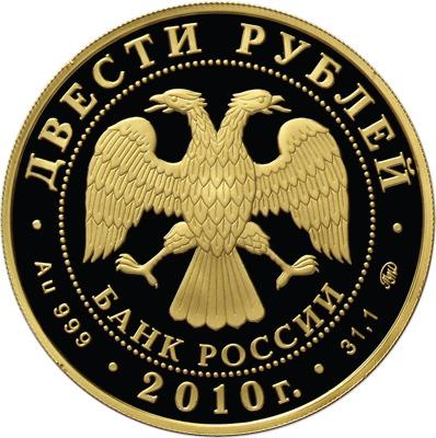 в центре - эмблема Банка России (двуглавый орёл с опущенными крыльями, под ним - надпись полукругом "БАНК РОССИИ"), обрамленная кругом из точек и надписями по кругу - вверху: "ДВЕСТИ РУБЛЕЙ", внизу: слева - обозначения драгоценного металла и пробы сплава, в центре - дата выпуска "2010 г.", справа - содержание химически чистого металла и товарный знак монетного двора.