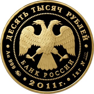 в центре - эмблема Банка России (двуглавый орел с опущенными крыльями, под ним - надпись полукругом "БАНК РОССИИ"), обрамленная кругом из точек и надписями, вверху - номинал: "ДЕСЯТЬ ТЫСЯЧ РУБЛЕЙ", внизу: слева - обозначения драгоценного металла, пробы сплава и товарный знак монетного двора, в центре - год выпуска "2011 г.", справа – содержание химически чистого металла и порядковый номер монеты №s__.